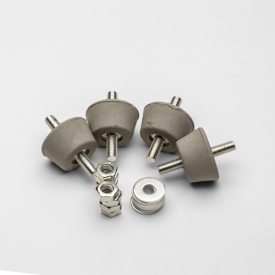 Et sett består av 4 stk 25 x 30 mm dempere i god kvalitet med elektrogalvaniseret stål. Hver demper tåler en maks. belastning på 15 kg. M8 gjenger.