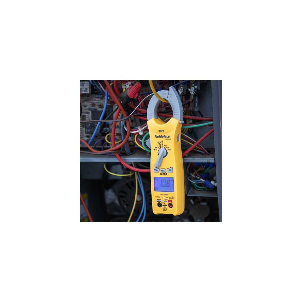 SC260 Compact Clamp Meter er en flott måler for testing av HVAC elektriske målinger. Den inkluderer True RMS-målinger, slik at du kan teste frekvensomformere mer nøyaktig, sammen med temperatur i både Fahrenheit og Celsius. SC260 har også en bakgrunnsbelysningsskjerm for å lese målinger på dårlig opplyste steder, og en solid svingbar magnet for håndfrie målinger.