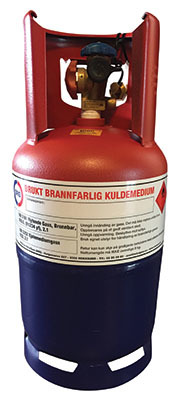 Ren og vakuumert stålbeholder (blå flaske med rød krage) med links gjenger på 12,3 liter for retur av brukt kuldemedie som er brannfarlig. Er kun for bruk med R32 og R1234yf.